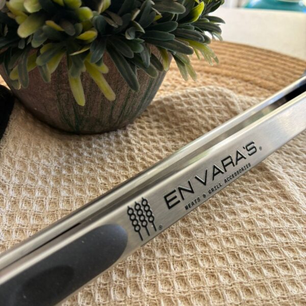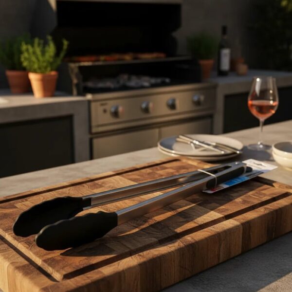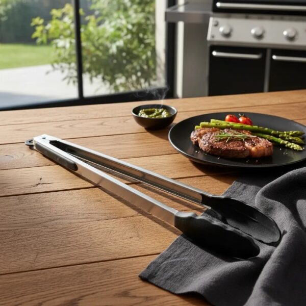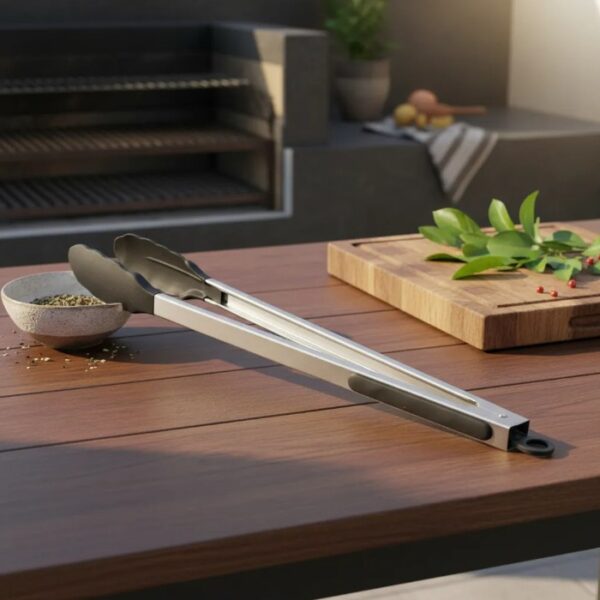 Domina la parrilla como un experto. Esta pinza de 40 cm está fabricada en acero inoxidable de alta calidad, ideal para manipular carnes, embutidos y vegetales manteniendo siempre una distancia segura del fuego.